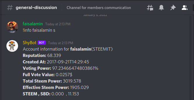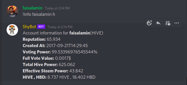 By default, the bot shows the account information for steemit but you can also get account information for the hive