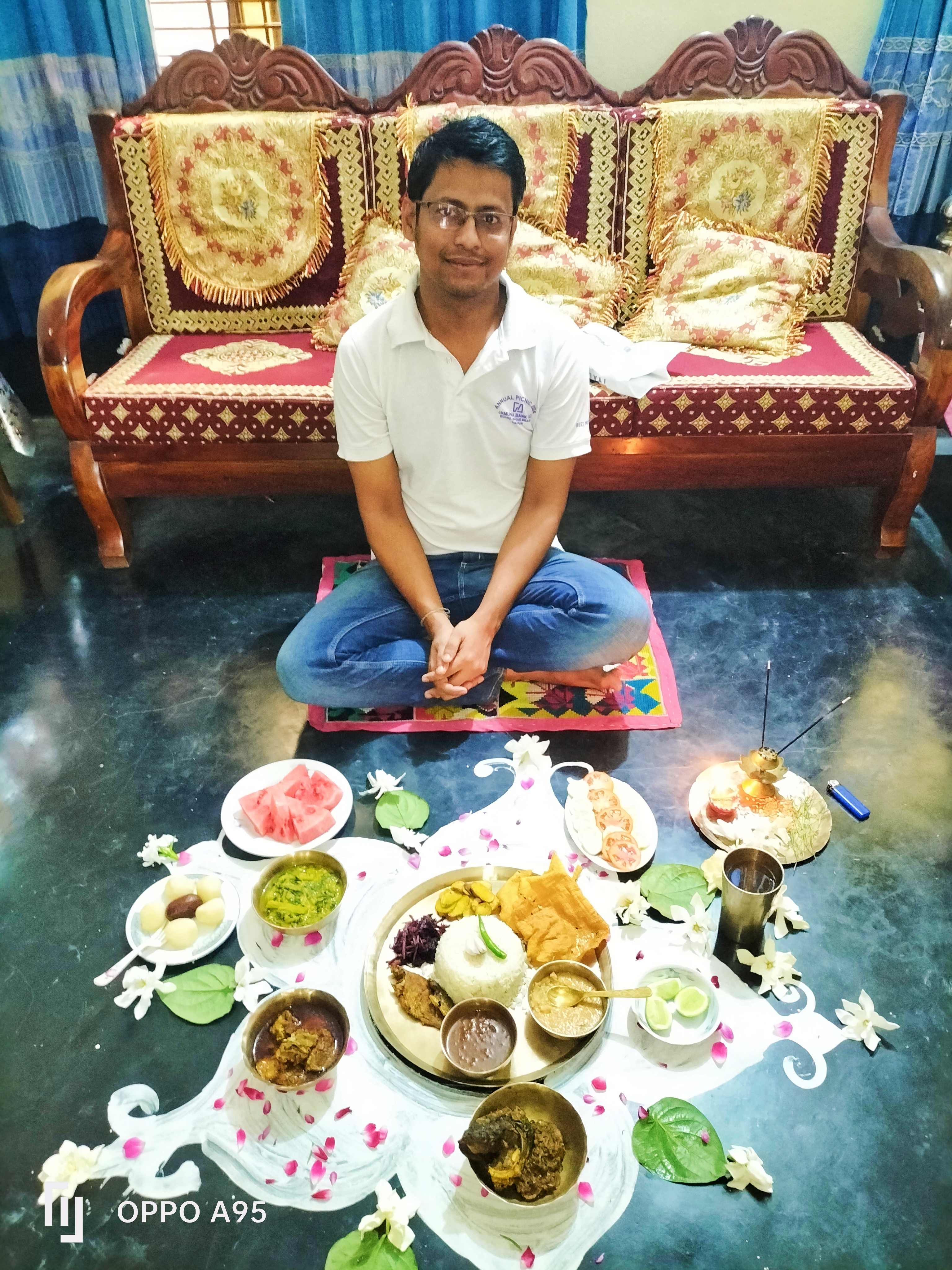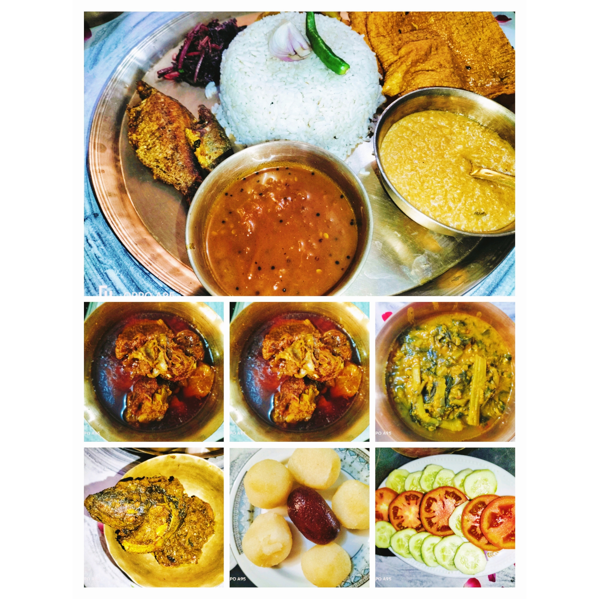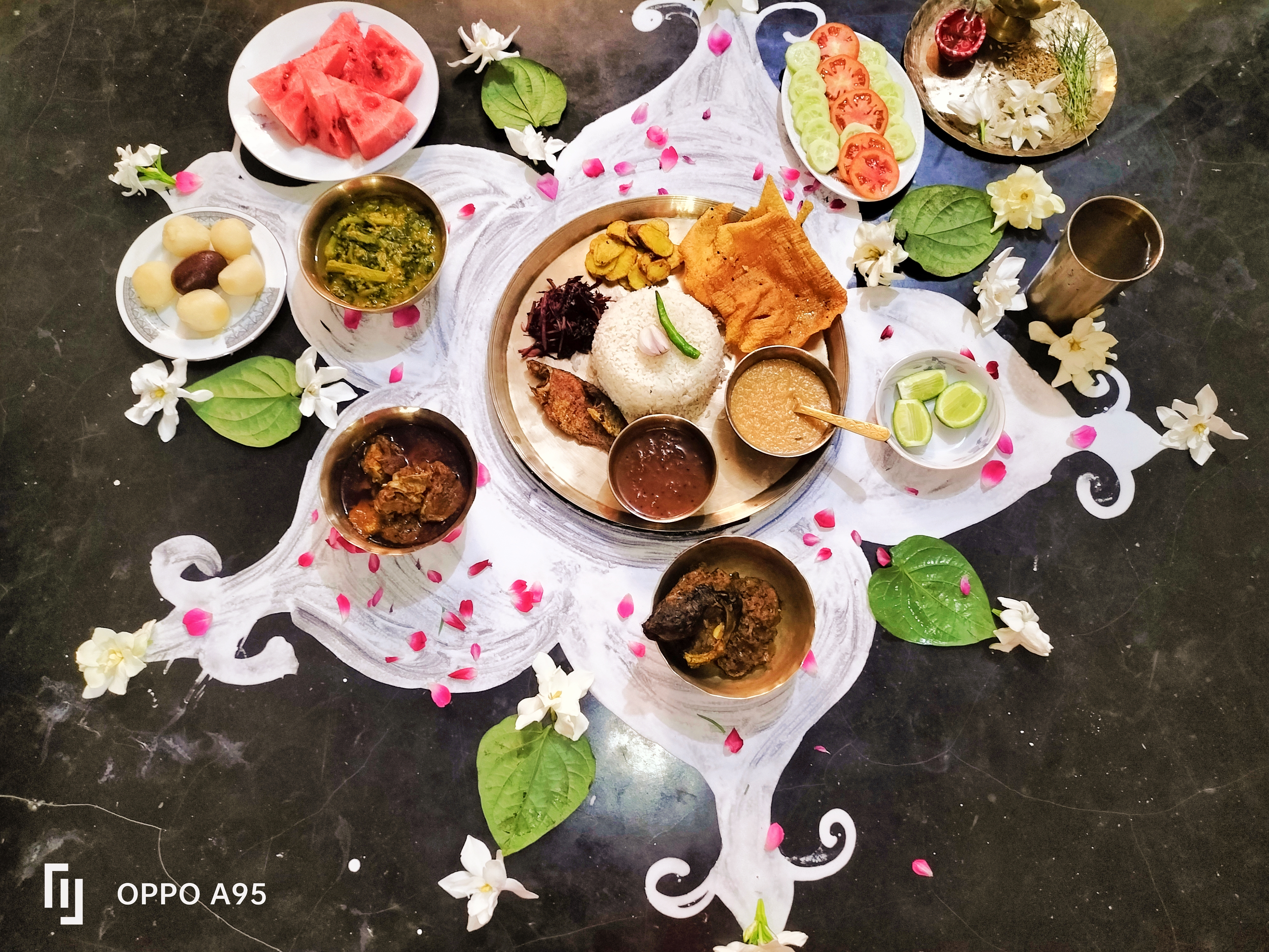 রান্না করা হলো খাসির মাংস,রুই মাছের কালিয়া,মাছ ভাজা,মসুর ডাল দিয়ে পুইশাক,আলু ভাজা,পাপড় ভাজা,টক,পায়েস,মিষ্টি, তরমুজ, লাল শাক ভাজা,সালাদ,লেবু।