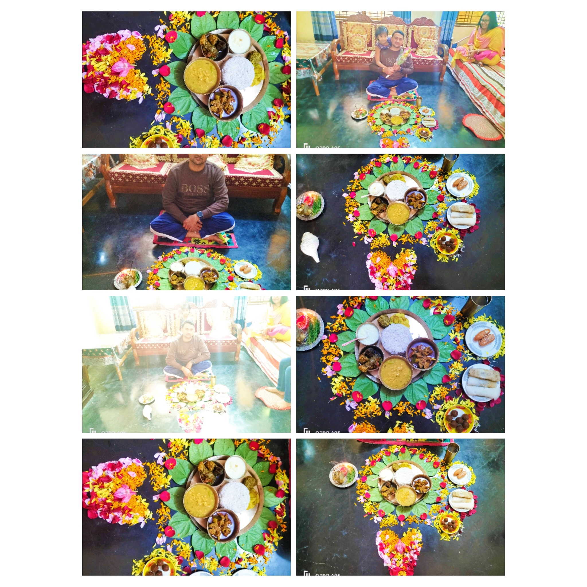 আসন পাতলাম।গাছের কিছু ফুল তুলে নিলাম,গোলাপ ও গাঁদা।বাকি ফুল কেনা ছিলো তাই দিয়ে চালিয়ে দিলাম।আসন পাতার পর ফুল দিয়ে সাজিয়ে নিলাম খাবার থালাসহ।এরপর ভাইকে বসালাম এবং ধুপকাঠিও মঙ্গলপ্রদীপ জ্বালিয়ে, সঙ্খবাজিয়ে,ধানদূর্বা দিয়ে আশির্বাদ করে পায়েস মুখে দিয়ে আইবুড়ো ভাত খাওয়ালাম।বেশ ভালো লাগছিলো মুহুর্ত টা।