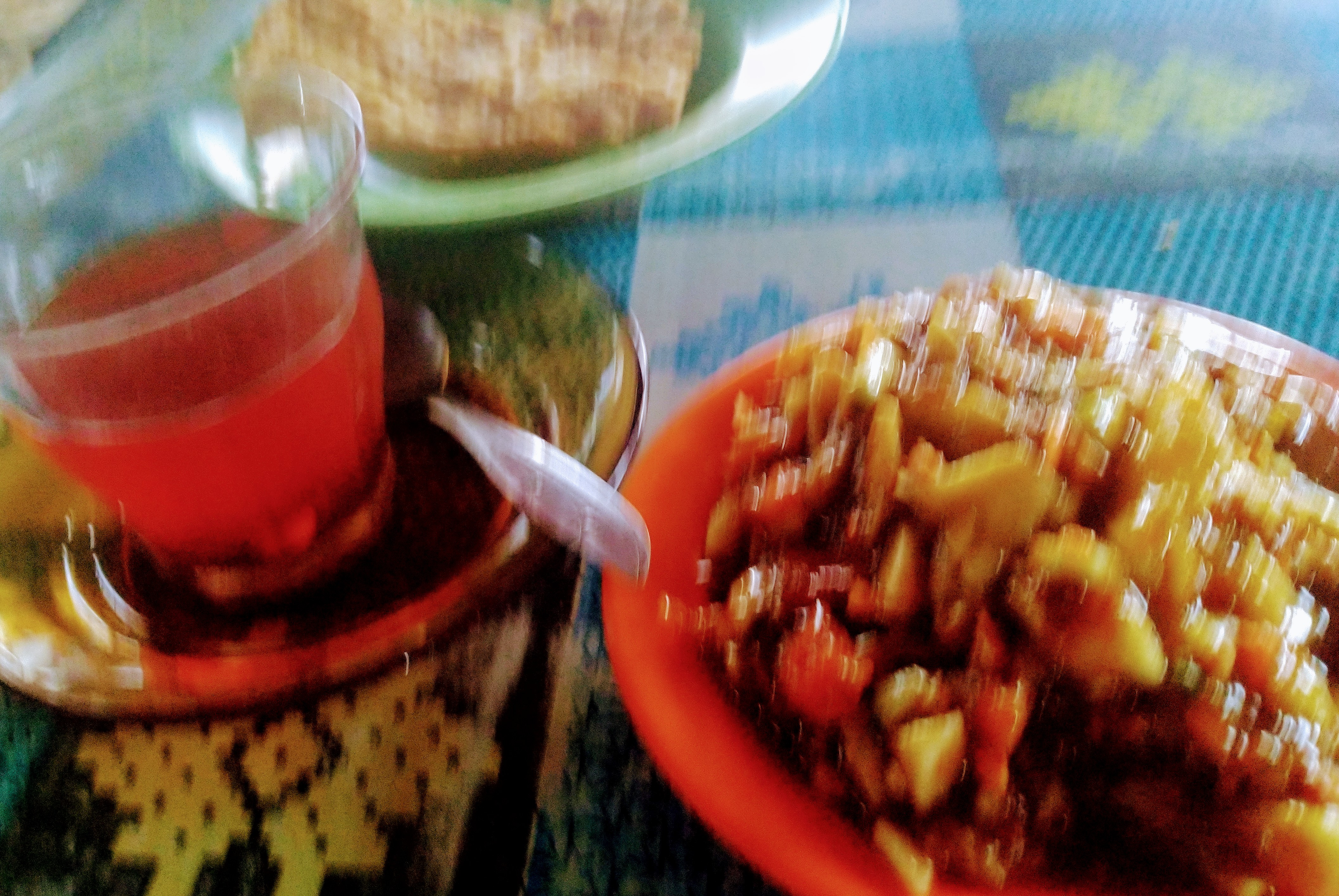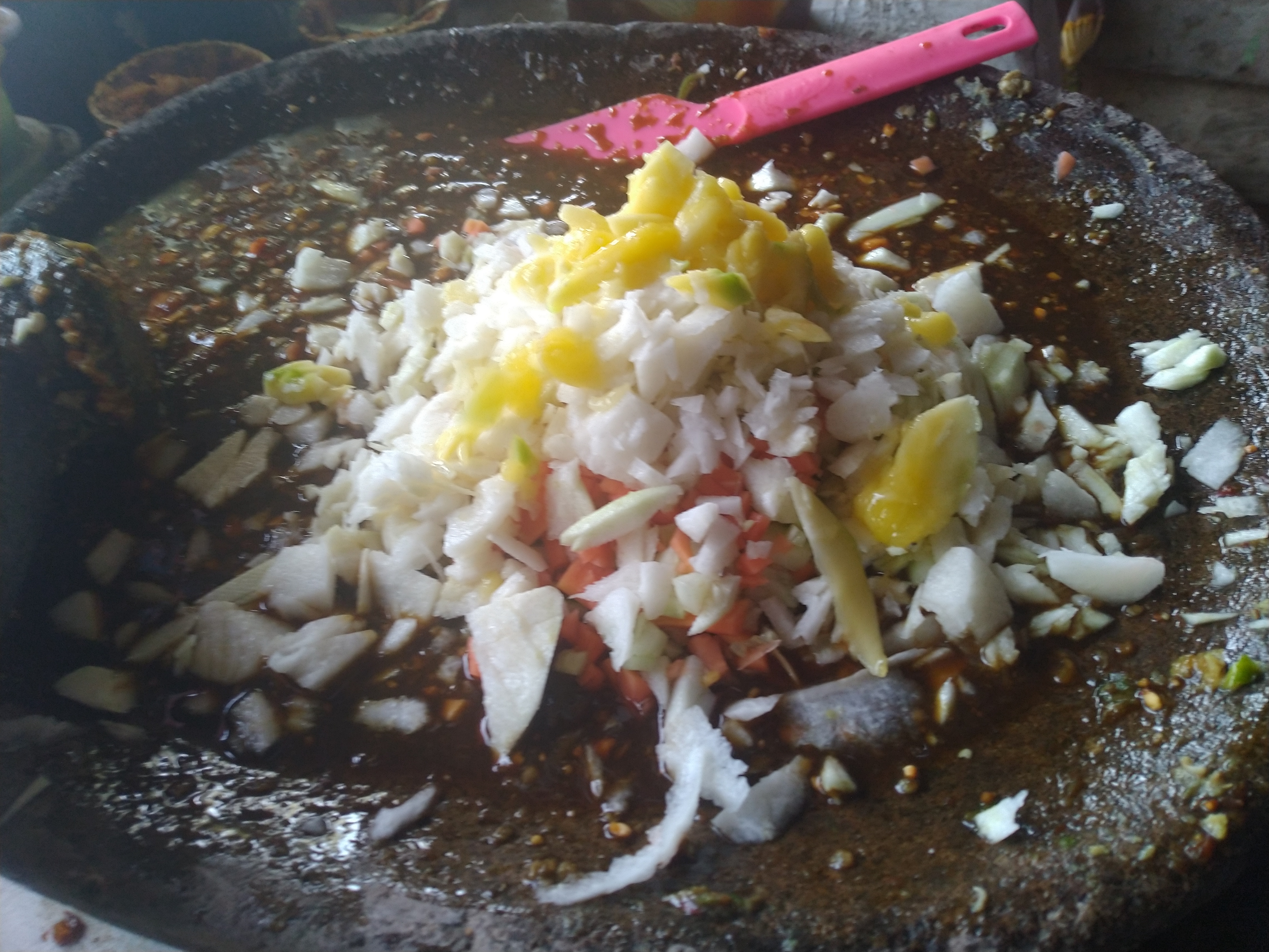 Rujak Aceh chopped various kinds of fruits, mango, pineapple, jicama, papaya, guava, mango, kedondong and many more that are not mentioned. These are all chopped and mixed with mashed spices using a stone specially made to smooth the rujak spices.