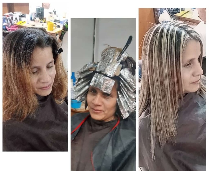 Ya al estar sentada me dividio el cabello y comenzo a irme colocando las plantillas y sacarme poco a poco los mechones para realizarme el trabajo de mechas duro un buen rato, ya que me saco muchas por todo el cabello, y me toco esperar el tiempo⏳ para que me la retiraran.