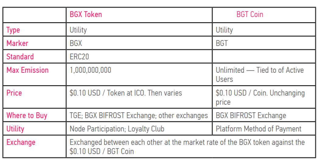Pemegang token BGX memiliki kemampuan untuk berpartisipasi dalam proyek yang sedang tumbuh (platform mendorong keterlibatan dan menghabiskan lebih dari pasar aplikasi lain, memperkuat efek ini), berbagi dalam pendapatannya (60% dari sebagian besar komisi transaksi pergi ke pemegang token BGX dan node), dan mengakses ekonominya.