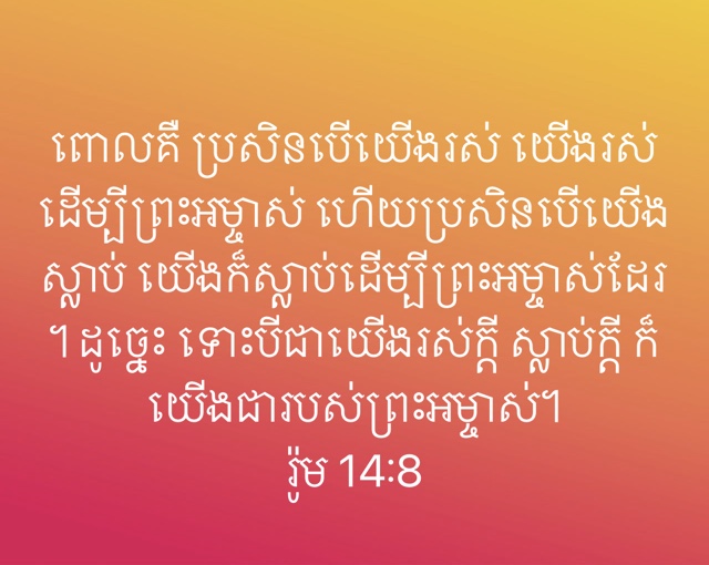 If we live, we live to the Lord; and if we die, we die to the Lord. So, whether we live or die, we belong to the Lord. (Romans 14:8) ถ้าเรามีชีวิตอยู่ก็เพื่อองค์พระผู้เป็นเจ้า และถ้าเราตายก็เพื่อองค์พระผู้เป็นเจ้า เพราะฉะนั้นไม่ว่าเรามีชีวิตอยู่หรือตายไปก็ตาม เราก็เป็นคนขององค์พระผู้เป็นเจ้า (โรม 14:8) 우리가 살아도 주를 위하여 살고 죽어도 주를 위하여 죽나니 그러므로 사나 죽으나 우리가 주의 것이로다. (로마서 14장 8절) 我们若活着,是为主而活;若死了,是为主而死.所以我们或活或死,总是主的人 (罗14:8) vì nếu chúng ta sống, là sống cho Chúa, và nếu chúng ta chết, là chết cho Chúa. Vậy nên chúng ta hoặc sống hoặc chết, đều thuộc về Chúa cả. (Rô-ma 14:8)