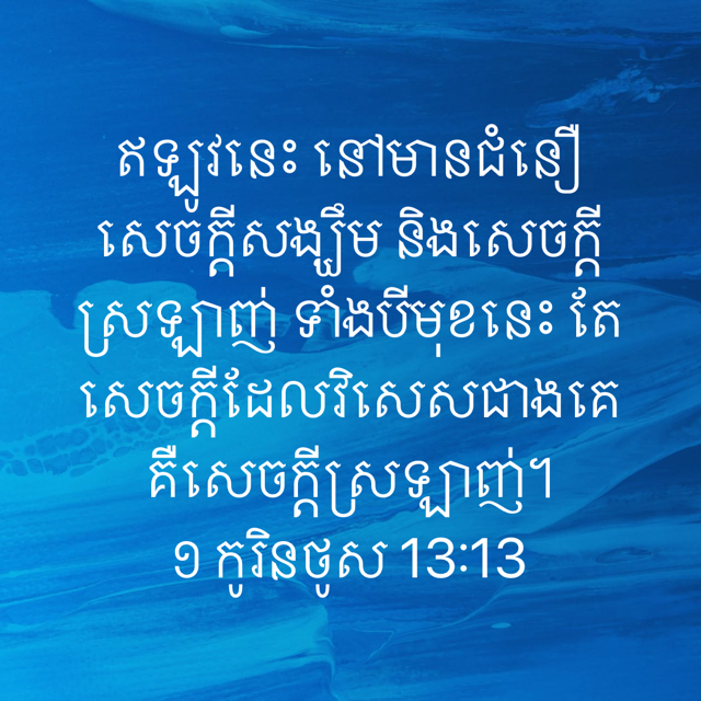 And now these three remain: faith, hope and love. But the greatest of these is love. (1 Corinthians 13:13) และบัดนี้ ทั้งสามสิ่งนี้ยังดำรงอยู่ คือความเชื่อ ความหวัง และความรัก แต่ความรักนั้นใหญ่ที่สุดในสามสิ่งนี้ (1 โครินธ์ 13:13) 如今常存的有信,有望,有爱;这三样,其中最大的是爱. (林前13:13) Nên bây giờ còn có ba điều nầy: Đức-tin, sự trông-cậy, tình yêu-thương; nhưng điều trọng hơn trong ba điều đó là tình yêu-thương. (I Cô-rinh-tô 13:13) 그런즉 믿음, 소망, 사랑, 이 세 가지는 항상 있을 것인데 그 중의 제일은 사랑이라 (고린도전서 13장 13절)