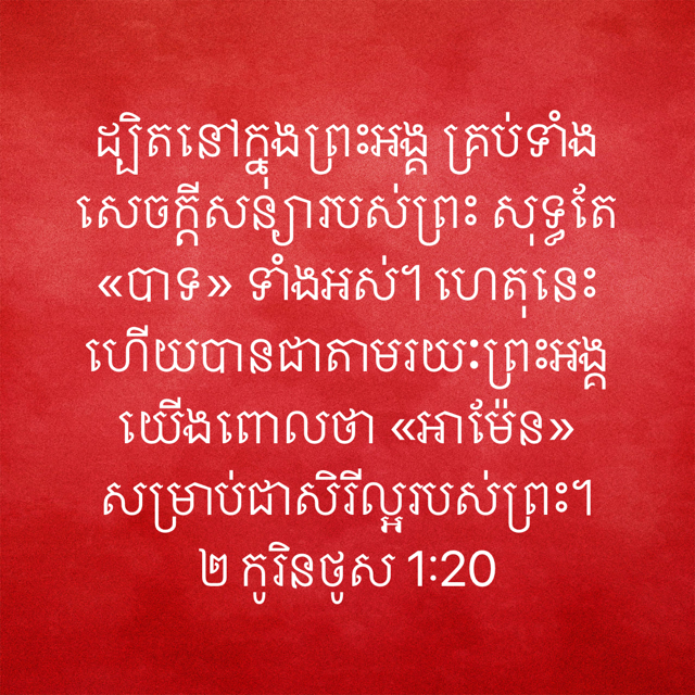For no matter how many promises God has made, they are "Yes" in Christ. And so through him the "Amen" is spoken by us to the glory of God. (2 Corinthians 1:20) เพราะว่าพระสัญญาต่างๆ ของพระเจ้าล้วนแต่เป็นจริงโดยพระเยซู เพราะเหตุนี้เราจึงพูดว่าอาเมนโดยพระองค์ ซึ่งเป็นการถวายพระเกียรติแด่พระเจ้า (2 โครินธ์ 1:20) 神的应许不论有多少,在基督都是是的,所以藉着他也都是实在的,叫 神因我们得荣耀. (林后1:20) Vì chưng cũng như các lời hứa của Đức Chúa Trời đều là phải trong Ngài cả, ấy cũng bởi Ngài mà chúng tôi nói “A-men,” làm sáng danh Đức Chúa Trời. (II Cô-rinh-tô 1:20) 하나님의 약속은 얼마든지 그리스도 안에서 예가 되니 그런즉 그로 말미암아 우리가 아멘 하여 하나님께 영광을 돌리게 되느니라 (고린도후서 1장 20)