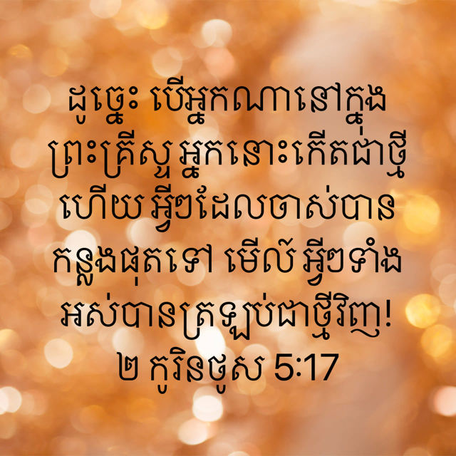 Therefore, if anyone is in Christ, he is a new creation; the old has gone, the new has come! (2 Corinthians 5:17) ฉะนั้นถ้าใครอยู่ในพระคริสต์ เขาก็เป็นคนที่ถูกสร้างใหม่แล้ว สิ่งสารพัดที่เก่าๆ ก็ล่วงไป นี่แน่ะกลายเป็นสิ่งใหม่ทั้งนั้น (2 โครินธ์ 5:17) 若有人在基督里,他就是新造的人,旧事已过,都变成新的了.(林后5:17) Vậy, nếu ai ở trong Đấng Christ, thì nấy là người dựng nên mới; những sự cũ đã qua đi, nầy mọi sự đều trở nên mới. (II Cô-rinh-tô 5:17) 그런즉 누구든지 그리스도 안에 있으면 새로운 피조물이라 이전 것은 지나갔으니 보라 새 것이 되었도다 (고린도후서 5:17)
