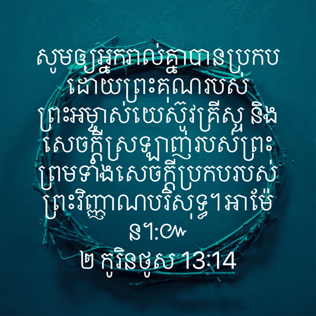May the grace of the Lord Jesus Christ, and the love of God, and the fellowship of the Holy Spirit be with you all. (2 Corinthians 13:13) ขอให้พระคุณของพระเยซูคริสต์องค์พระผู้เป็นเจ้า ความรักของพระเจ้า และการมีส่วนกันที่มาจากพระวิญญาณบริสุทธิ์ จงดำรงอยู่กับท่านทั้งหลายทุกคนเถิด (2 โครินธ์ 13:13) 愿主耶稣基督的恩惠,神的慈爱,圣灵的感动,常与你们众人同在! (林后13:14) Nguyền xin ơn của Đức Chúa Jêsus-Christ, sự yêu-thương của Đức Chúa Trời, và sự giao-thông của Đức Thánh-Linh ở với anh em hết thảy! (II Cô-rinh-tô 13:13) 주 예수 그리스도의 은혜와 하나님의 사랑과 성령의 교통하심이 너희 무리와 함께 있을지어다 (고린도후서 13장 13)
