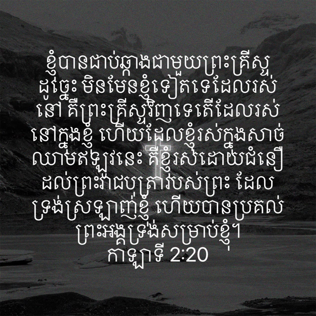 I have been crucified with Christ and I no longer live, but Christ lives in me. The life I live in the body, I live by faith in the Son of God, who loved me and gave himself for me. (Galatians 2:20) ข้าพเจ้าเองไม่มีชีวิตอยู่ต่อไป แต่พระคริสต์ต่างหากที่ทรงมีชีวิตอยู่ในข้าพเจ้า ชีวิตซึ่งข้าพเจ้าดำเนินอยู่ในร่างกายขณะนี้ ข้าพเจ้าดำเนินอยู่โดยความเชื่อในพระบุตรของพระเจ้าผู้ได้ทรงรักข้าพเจ้า และได้ทรงสละพระองค์เองเพื่อข้าพเจ้า (กาลาเทีย 2:20) 我已经与基督同钉十字架,现在活着的不再是我,乃是基督在我里面活着;并且我如今在肉身活着,是因信 神的儿子而活,他是爱我,为我舍己. (加2:20) Tôi đã bị đóng đinh vào thập-tự-giá với Đấng Christ, mà tôi sống, không phải là tôi sống nữa, nhưng Đấng Christ sống trong tôi; nay tôi còn sống trong xác-thịt, ấy là tôi sống trong đức-tin của Con Đức Chúa Trời, là Đấng đã yêu tôi, và đã phó chính mình Ngài vì tôi. (Ga-la-ti 2:20) 내가 그리스도와 함께 십자가에 못 박혔나니 그런즉 이제는 내가 사는 것이 아니요 오직 내 안에 그리스도께서 사시는 것이라 이제 내가 육체 가운데 사는 것은 나를 사랑하사 나를 위하여 자기 자신을 버리신 하나님의 아들을 믿는 믿음 안에서 사는 것이라 (갈라디아서 2장 20)