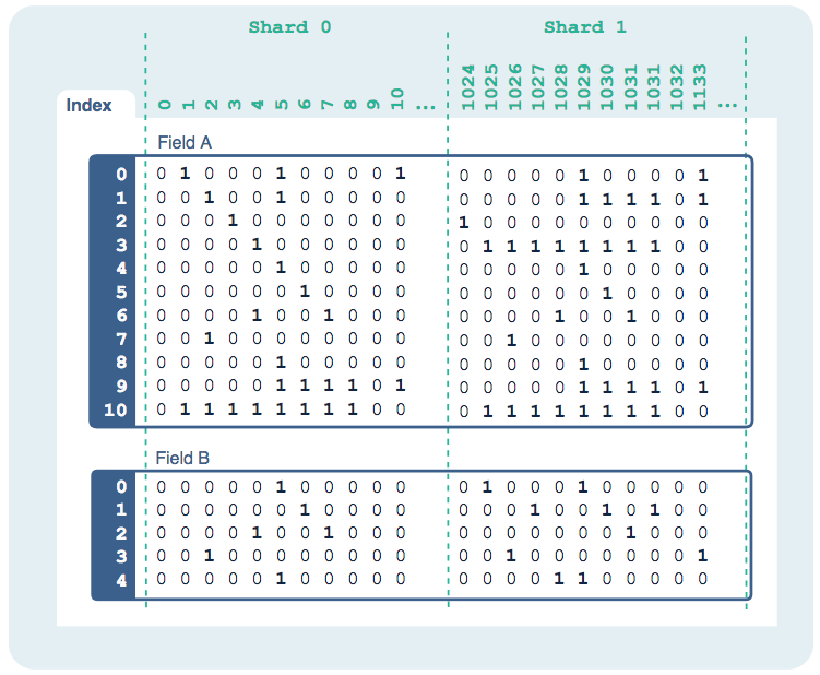 Using a data repository, cloud, and operating system agnostic approach, Pilosa acts as an additional indexing system that can be applied to an existing repository, including a flat file. Looking at the example below, if you imagine that the column headers represent Customer_ID, and the rows in Field A indicate product inventory, then each 1 represents the products purchased by each Customer_ID.. You will also notice that this is separated into shards, this is how Pilosa scales horizontally so effectively and was one of the huge technical hurdles that they solved with the project. These bitmaps are very small and are compressed in addition to that and do not need to be decompressed to read. Pilosa’s software can store a knowledge representation of underlying data in memory, making it orders of magnitude smaller and unimaginably fast.