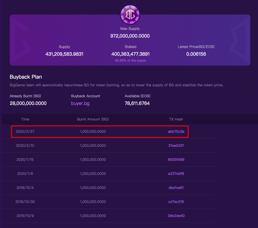 2월 27일 빅게임은 시장에서 BG토큰을 매입하였고 100만개를 소각하였습니다. 현재까지 총 14번 소각을 진행하였고 2,800만개의 토큰이 소각되었습니다. BG 토큰의 가격이 급등하는 등 특이 사항이 없을 경우 비지 팀은 매달 200만개의 토큰을 바이백하여 소각하려는 계획을 가지고 있습니다.