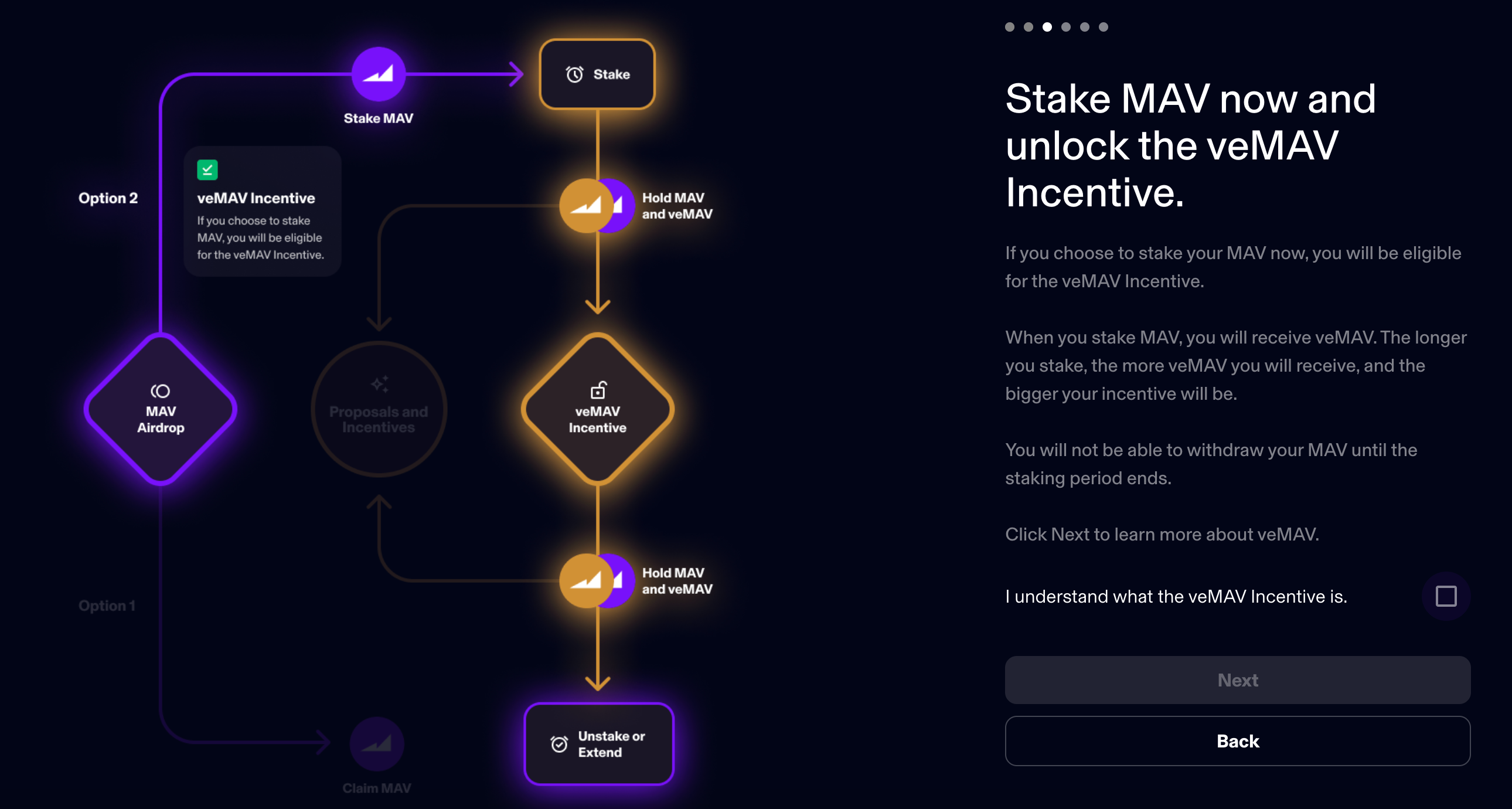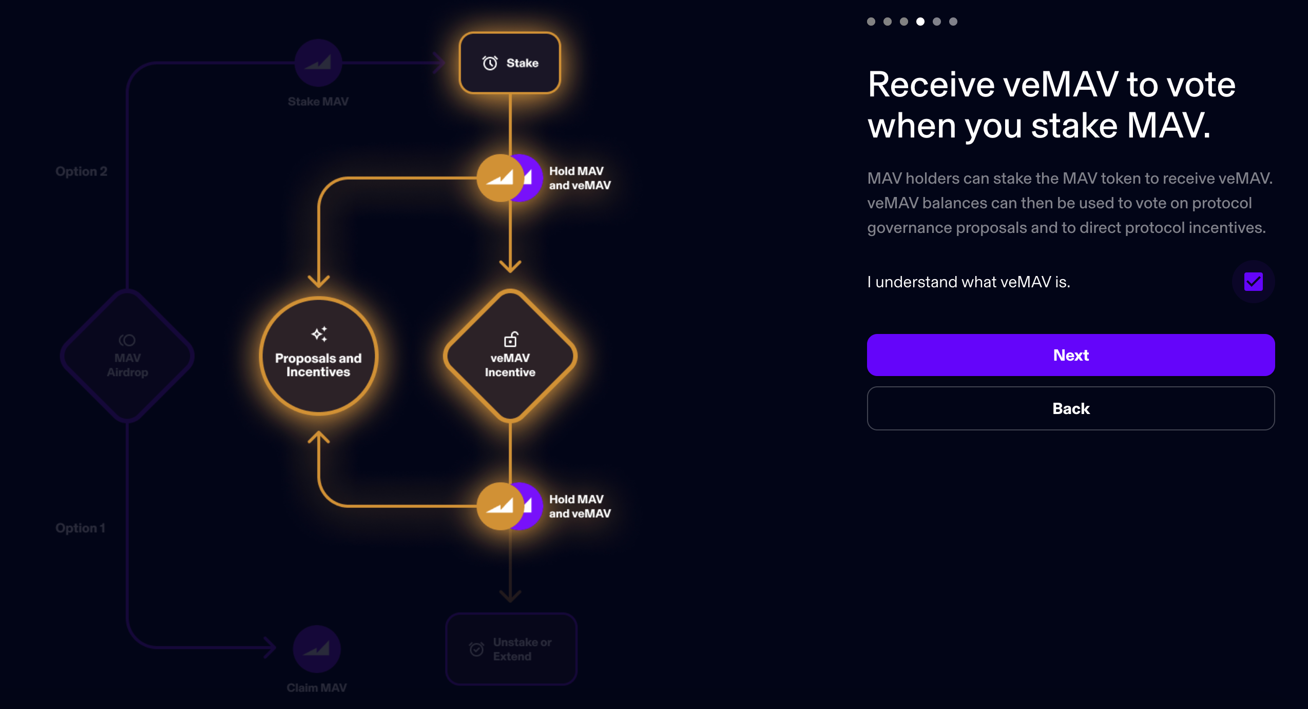 - MAV 토큰을 스테이킹해서 veMAV로 락업한 다음 락업에 대한 인센티브를 받는 것도 가능합니다