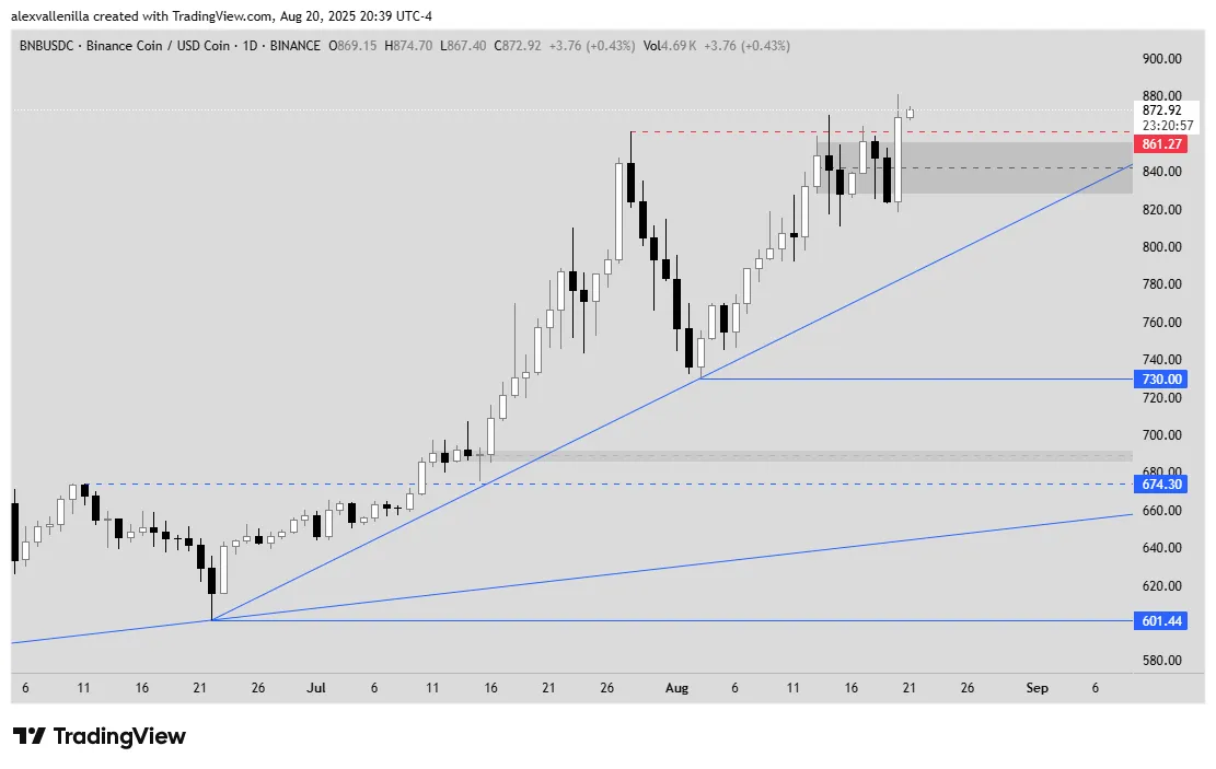 Binance Coin (BNB) hits a new all-time high driven by institutional demand and its expanding ecosystem, outperforming Bitcoin. / TradingView