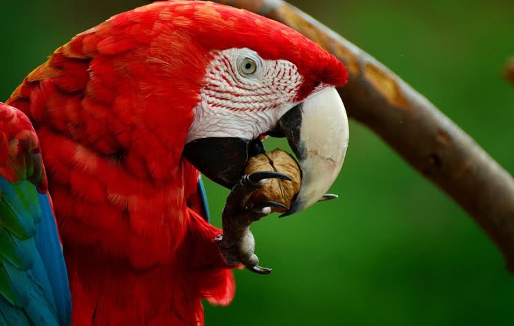 Scarlet macaw is one of the most beautiful and largest member of macaw family. They inhabit in humid evergreen forests across Central and South America. They are famous for their colorful plumage. They have bright red plumage with a blue back. Their upper wings are yellow and edged with green color.