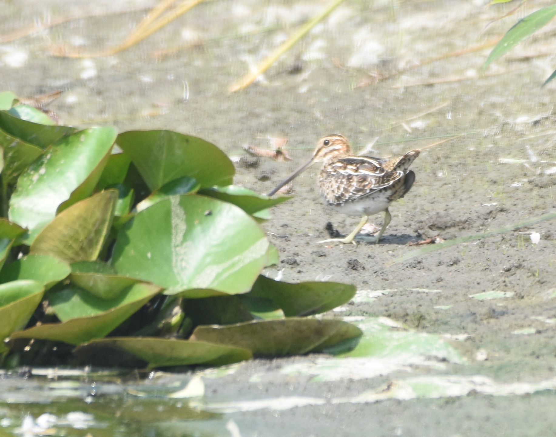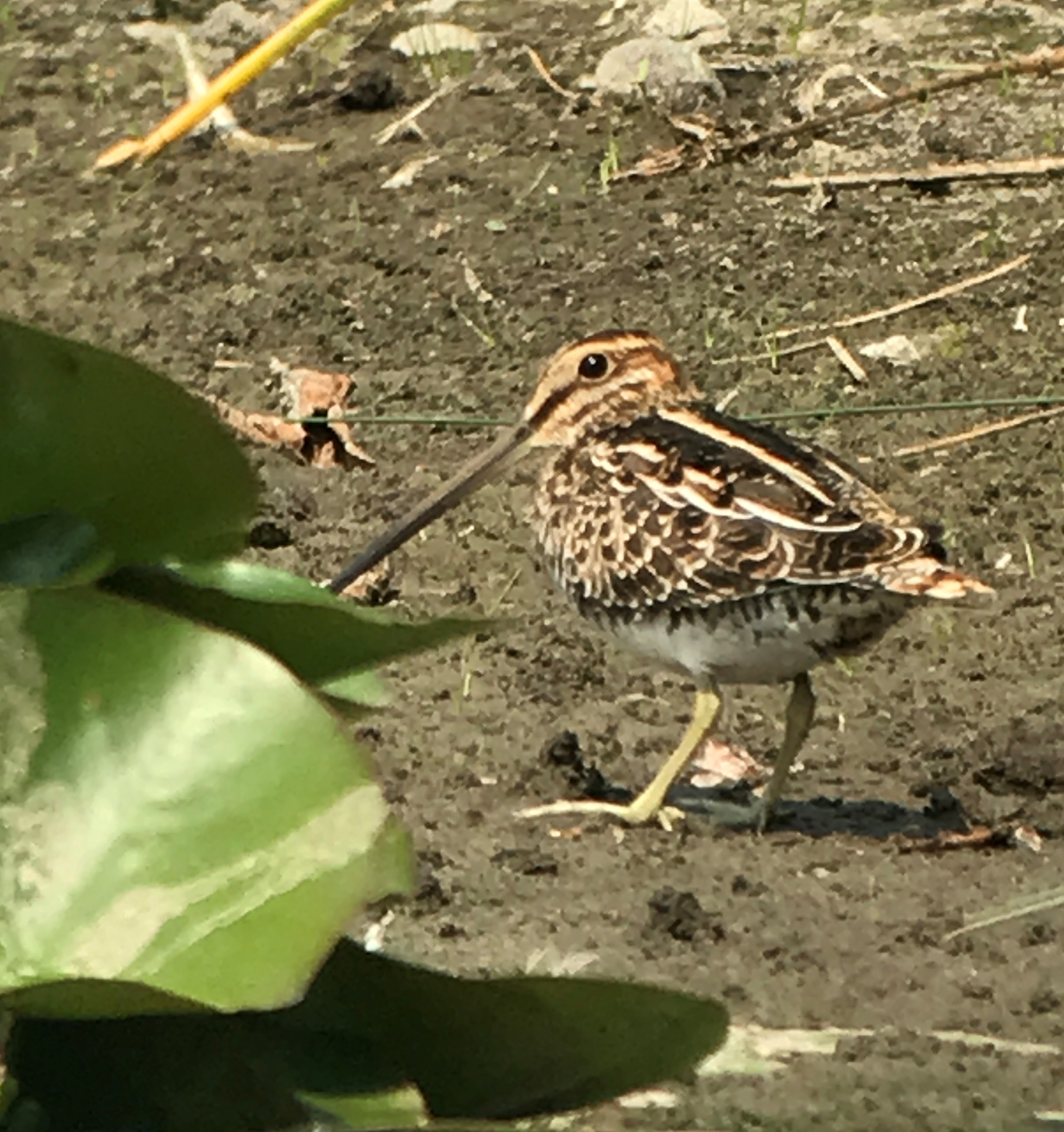 I walked around to the far side of the bar, and on popping out through the bushed at the side of the pond I flushed a small group of shorebirds. Wilson's Snipe has a very distinctive look in flight. It has a long heavy bill, and it flys in a zig-zag sort of flight that is immediately recognizable. I was able to see where the snipe landed, and got the photo at the top of this post via digiscoping with my iPhone and Kowa scope. The lower photo was with my camera.