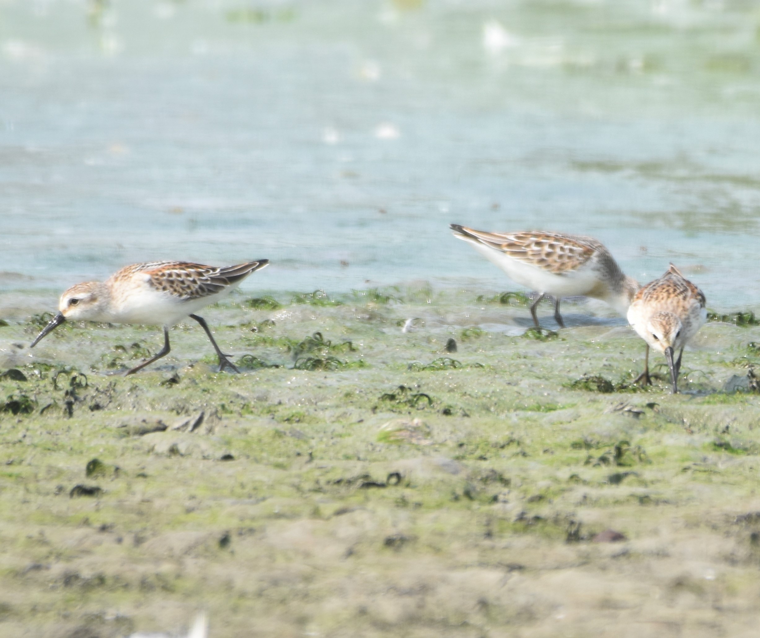 Today on my way back to Tacoma from church in Puyallup I made my usual stop at the Levee Pond on the Fife side of the Puyallup River to see if any new shorebirds had dropped in since my last visit. On initial viewing I saw no shorebirds at all, but the pond is starting to dry up in the warm August weather, and so the sand bar in the middle of the pond was high enough that I couldn't see the far shore of the bar from the observation deck.