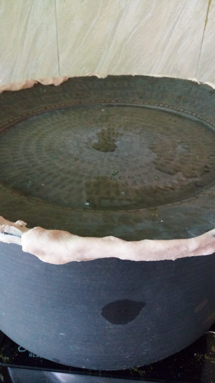 After chicken get cooked spread half cooked rice in layers sprinkle biryani masala and ghee over and close with lid and seal with dough