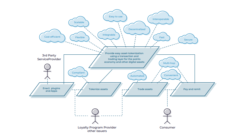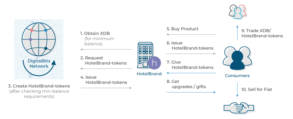 DigitalBits는 새로운 토큰을 생성 HotelBrand 당신의 브랜드를, 그리고 그들이 받고자하는 토큰의 최대 수를 나타냅니다. 소비자가 호텔 중 하나에서 방을 예약하면 내부 알고리즘에 따라 일부 토큰을 소비자에게 양도합니다. 사용자는 즉시 지원하여 응용 프로그램의 증가 HotelBrand 토큰 볼 수 DigitalBits 그녀가 정기적으로 다른 브랜드와 함께 사용합니다. 또한 그녀는 다른 신청서를 설치하거나 다른 충성도 카드 양식을 작성할 필요가 없기 때문에 기쁘게 생각합니다. 나중에 소비자는 HotelBrand 토큰 중 일부를 사용하려고합니다 .HotelBrand의 객실을 비우고 나머지를 토큰으로 변환하여 다음 항공편의 할인 혜택을 받으십시오 또한 소비자는 DigitalBits 네트워크의 비용 증가로 이익을 얻기 위해 주기적으로 토큰 중 일부를 XDB 토큰으로 변환하도록 선택합니다 .