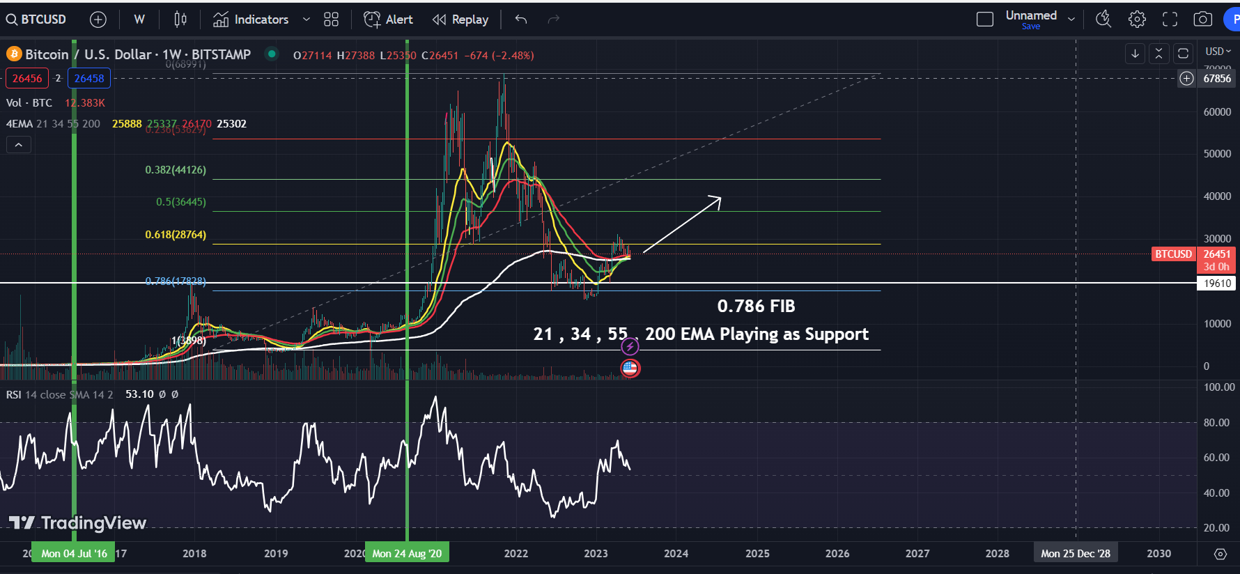 if we draw FIB retracement From start of BULL market to the 2021 top the 0.786 will be the area that we are right now. the 21 , 34 , 55 , 200 Weekly EMA play as support now.