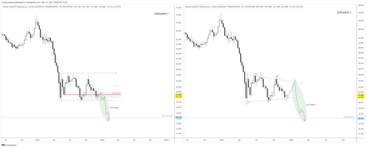 Alt season updateananda181 (25)in #bitcoin • 4 years ago BTC.D - Bitcoin Dominance Update Scenario 1 : it gonna get rejected here at 41.70% lvl. triggering an Alts Season. Scenario 2 : it gonna pump further more to the 45% lvl. and followed by another retracement triggering an Alts Season