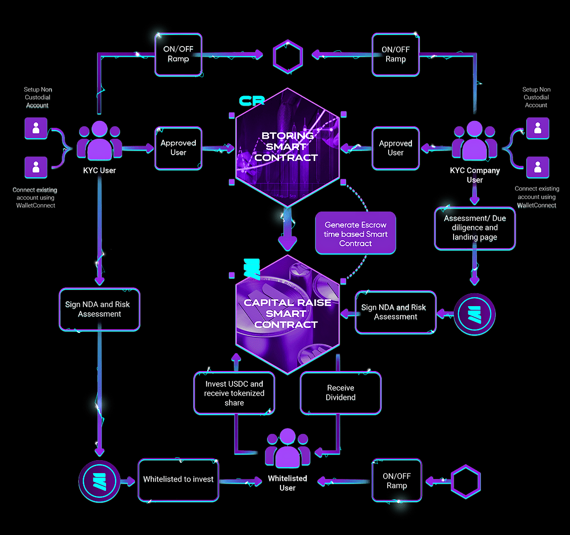 Btorings’ one-stop-shop DAPP has the user as its core focus, ensures a simple flow, and once onboarded and passed KYC/AML an easy and user-friendly interface to manage the investment portfolio, share, funds, and dividends with simplicity all in one place.