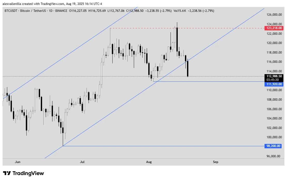 Bitcoin breaks uptrend and falls to $112,700, facing crucial support. We analyze what this means for cryptocurrency trading and investing. / TradingView