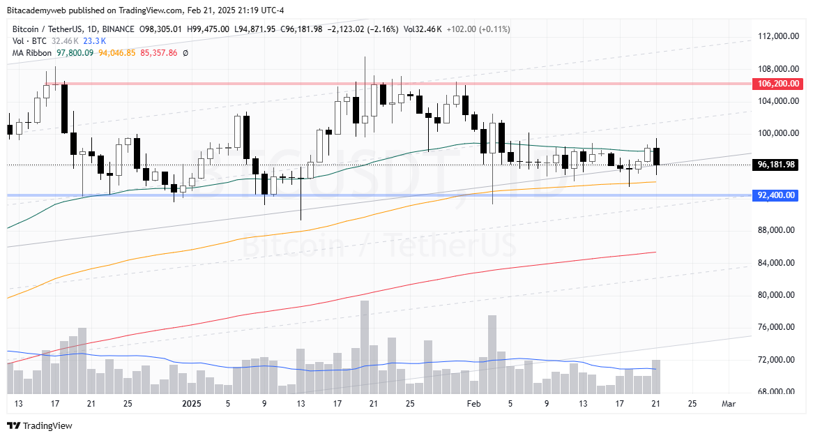 The Bitcoin market faces a complex outlook, with downward pressures from the Bybit hack and negative economic data. However, it still has bullish potential in the medium and long term due to its role as a hedge against inflation. Investors should keep an eye on the support at $92,400 and the resistance at $106,200, as these levels will define the next significant move.