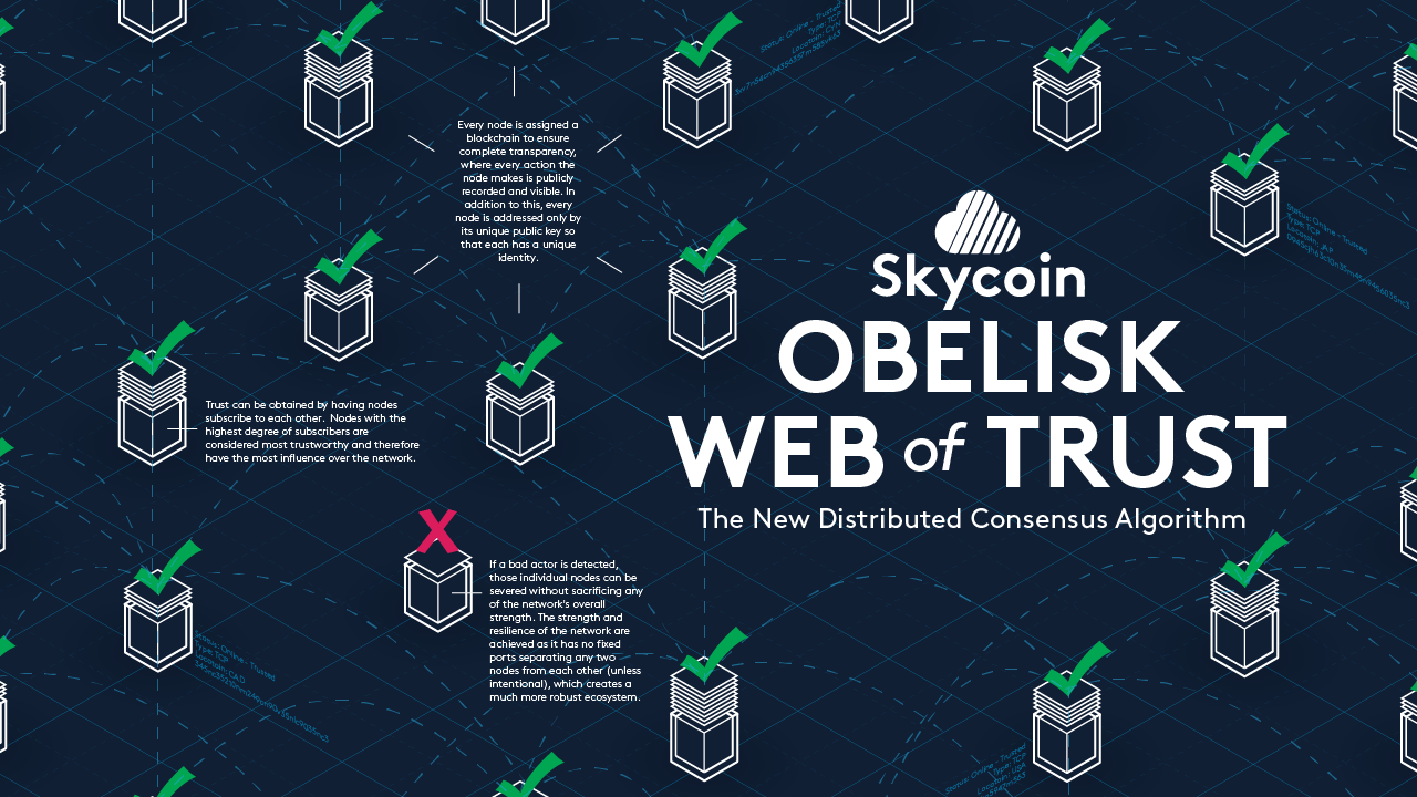 Obelisk is Skycoin's innovative consensus algorithm, which replaces POW and POS with a web of trust. The new cryptographic and network primitives allow verification of mathematical conditions for unanimous network consensus, both for public and private blockchains. The new network primitives also enable detection of malicious node behaviour. Obelisk was inspired by academic research into adversarial distributed time stamping and algorithms such as Ben-Or's, Paxos, and the Castro-Liskov PBFT algorithm. It is a new solution to the Byzantine Generals problem, which offers strong mathematical security guarantees, even when the majority of nodes are hostile