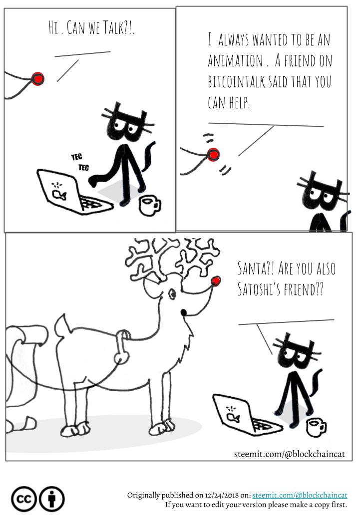 If you want to change the dialogues, christmas and new year greetings, adding images and create you own new stories with the Santa's reindeer and Blockchain Cat, it's under Creative Commons attribution license. Anyone can copy, distribute, display, perform and remix the work if credit the original creator. To make new versions easier, there is a shared public Google Presentation file that you can copy and edit if you like.
