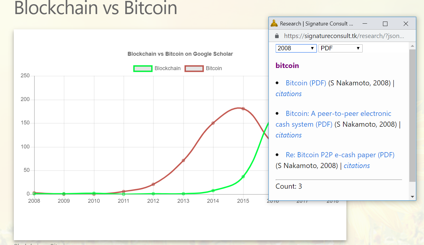 Here's something that I have wanted to spend more time on, but I present to you as a data dump. It's two Google Scholar searches, for Bitcoin and Blockchain.