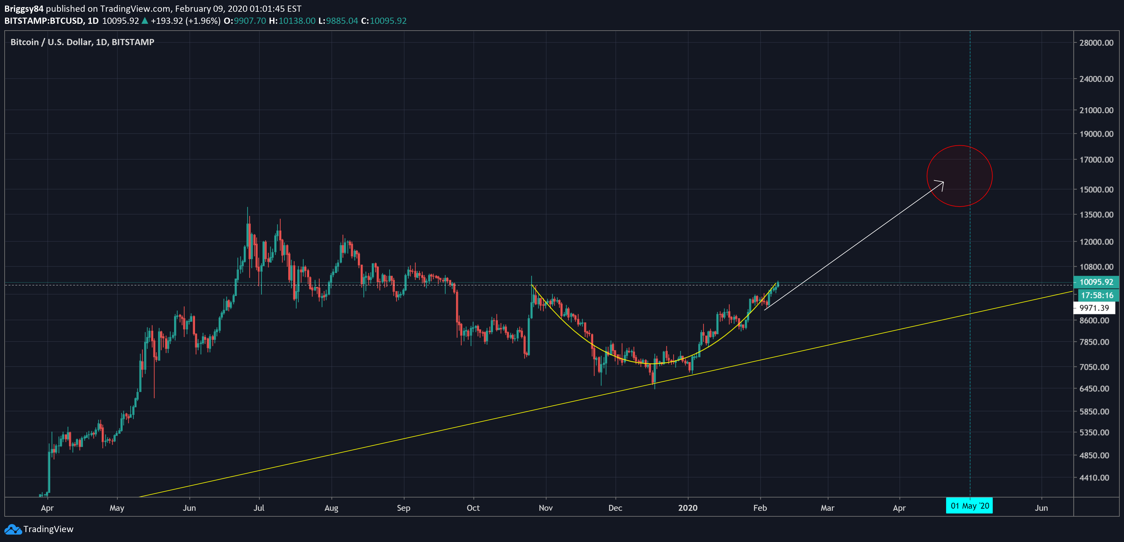 A cup has formed, and we might see a pull back soon to form a handle before the bigger climb towards the halvening this May (tentatively).
