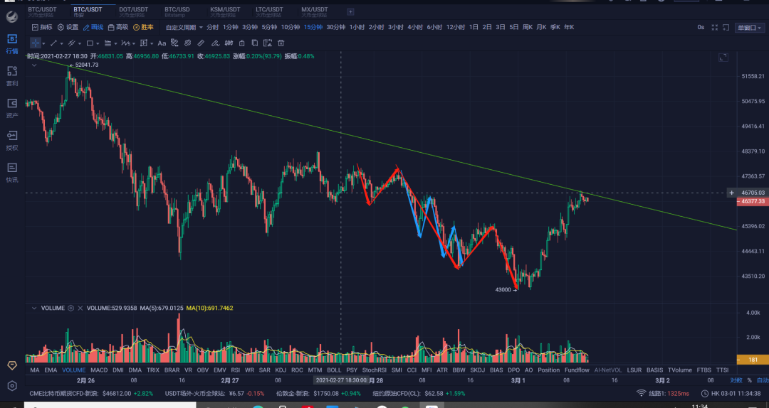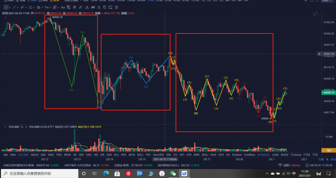 这三个框框的结构目前较为清晰,同时我们昨天提出的43XXX有可能是底部,就算不是底部向下也不会运行很远,行情基本上符合预期 437XX向下仅仅运行不到1000美金,就开始新的驱动上攻。