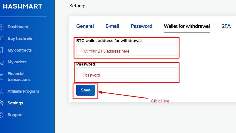In the next windows, put your BTC address in the box. Also, put your existing password and click on the "save" button.