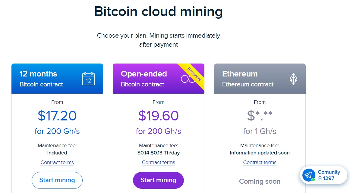 Offer 2: An open-ended Bitcoin contract starting from $29.40 for 300 Gh/s and an additional maintenance fee of $0.13 Th/day is required. The platform claims that this one is the best selling offer.