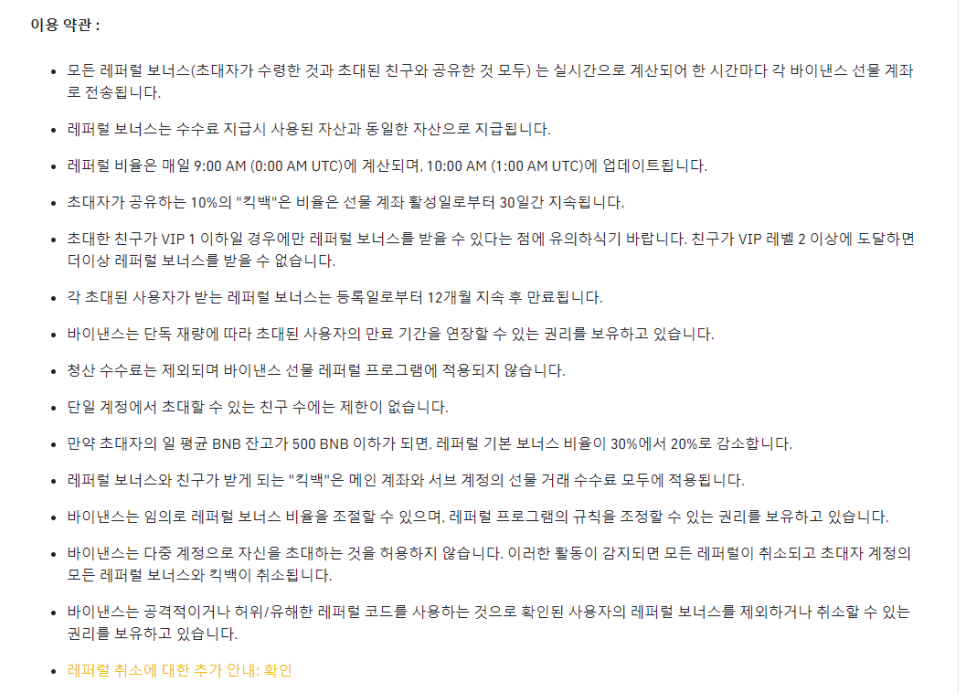 바이낸스 레퍼럴 조항을 보면, 맨 마지막에서 3번째 항목을 살펴보면 이렇게 바이낸스 셀퍼럴 행위가 적발되었을 시 레퍼럴 취소 및 보너스와 킥백(수수료 할인)을 취소시킨다는 항목을 살펴볼 수가 있는데요. 원래 사용자 초대를 목적으로 진행되는 할인 혜택인 만큼 이를 본인이 직접 받는 행위는 적발하여 취소시킨다는 취지로 생각해볼 수 있습니다.