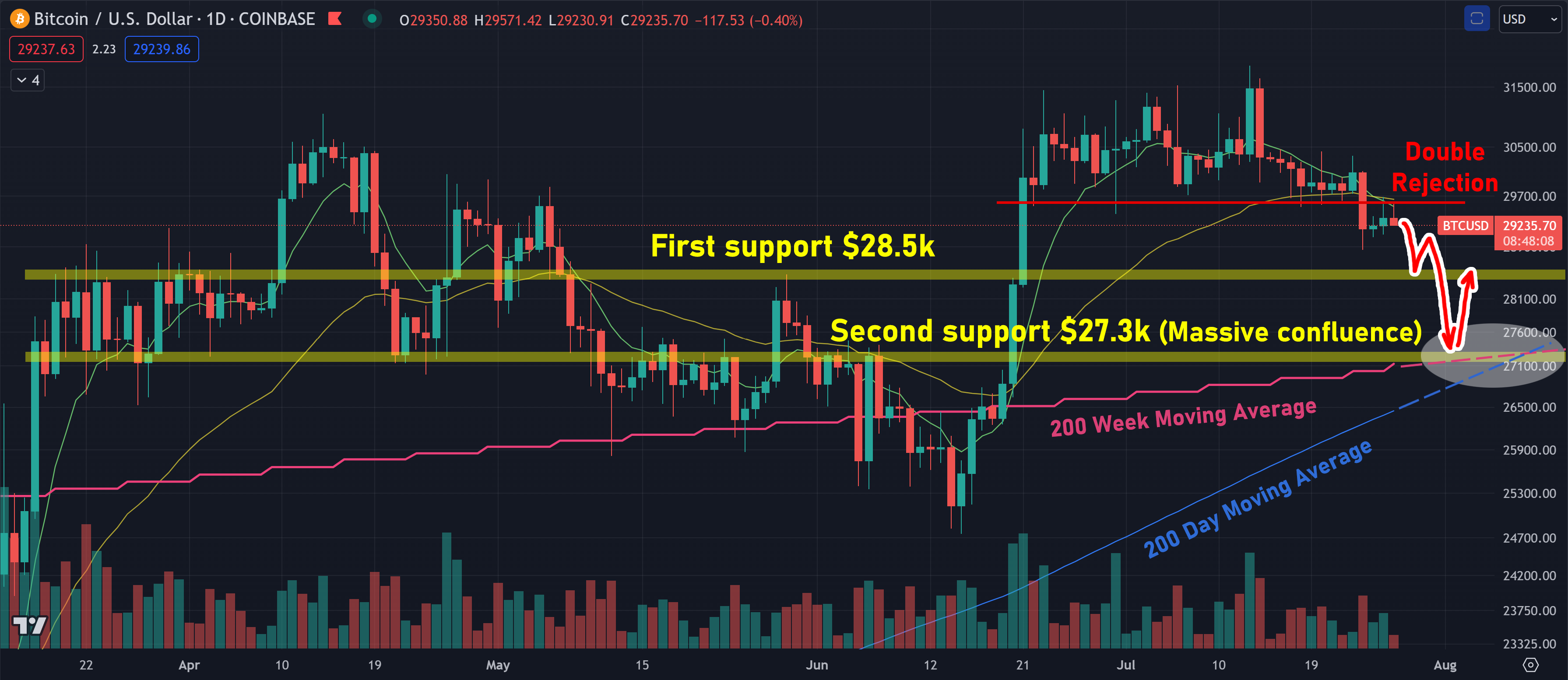 $28.5k. If this doesn't hold, which is quite possible, $27.3k is the next, extremely strong support level. I expect a likely rebound from here if it drops this far.