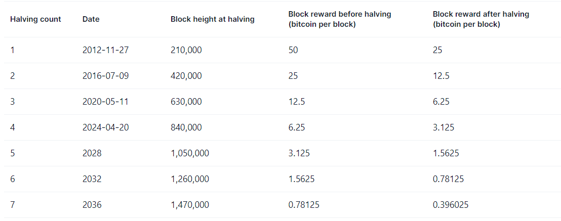 The next bitcoin halving is expected to happen on April 20, 2024, at the block height of 840000. When this happens, bitcoin’s block reward will be reduced to 3.125.