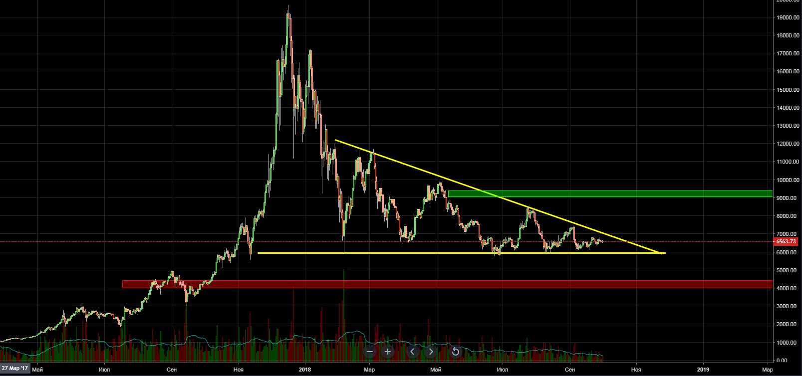 Взгляните на данный весьма интересный паттерн, цена BTC движется внутри нисходящего треугольника, при этом диапазон движения цены с каждым разом сужается всё сильнее.