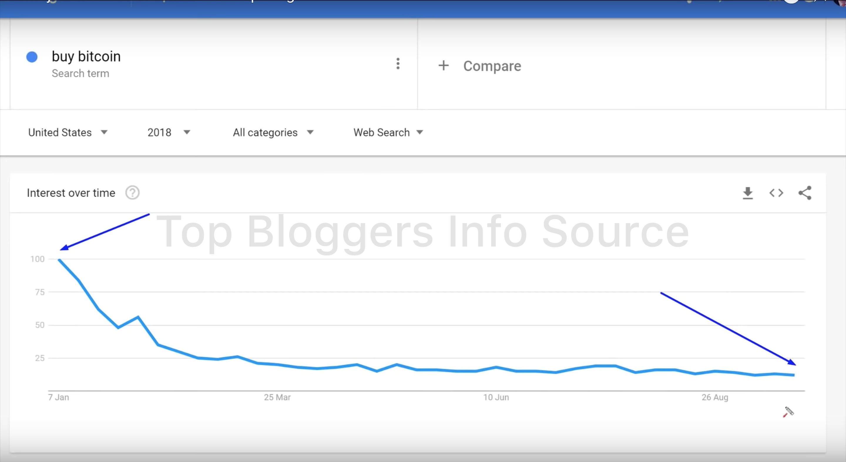Сезонность означает, что в некоторые периоды времени BTC растёт, а в другие выглядит очень слабо. Исторически, с июня по октябрь, рыночные показатели цены Bitcoin весьма слабые, подтверждение этому мы видели и в этом году. Однако, в период с октября по декабрь Bitcoin показывает хороший рост, как это было в прошлом году, а также много раз в прошлом. Вторым фактором являются настроения на рынке. Если смотреть на график интереса к Bitcoin по трендам Google, можно увидеть, как люди перестали искать информацию о нём, а это является хорошим, бычьим индикатором для тех, кто двигается против массового хайпа.