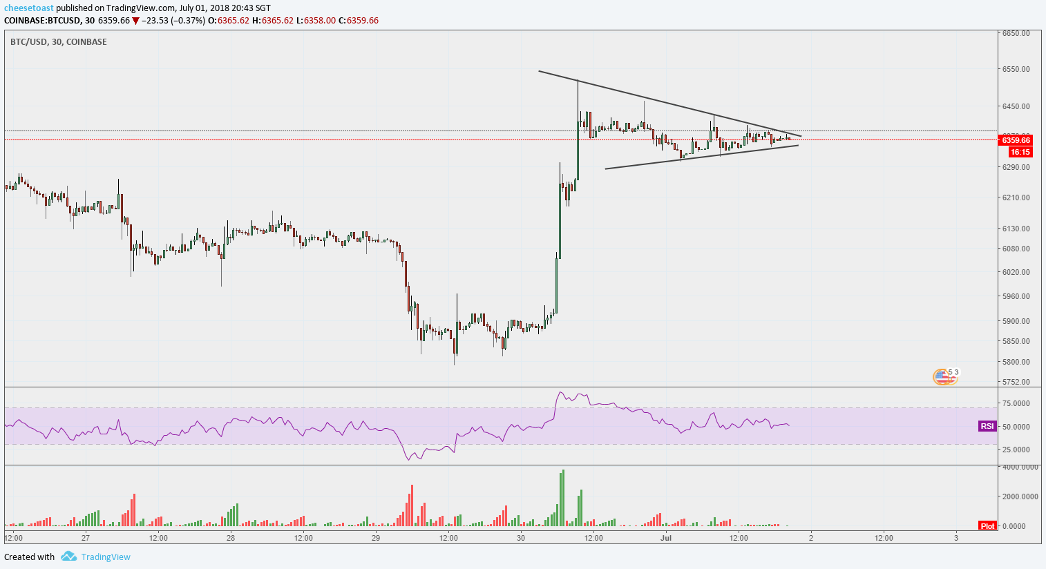 We can now see that Bitcoin is starting to coil after a resurgence from the recent lows near $5,800. This is often called a pennant formation which will typical break out with strong momentum in a direction, after a period of consolidation.