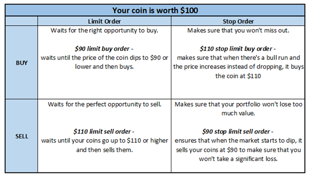 By combining all of these different orders, you can create a quite sophisticated trading system. Your limit buy orders make sure to take advantage of falling prices, while your stop limit buy orders are there to make sure that you won't miss out on the next bull run. The limit sell orders ensure that you will sell your coins at the most profitable moment and the stop limit sell orders are securing you against significant dips.