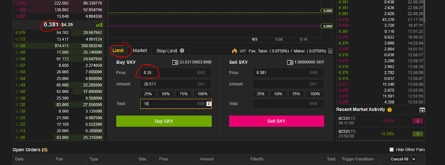 First thing to note on the chart is the current price on the left, which changes in real-time. Next, select the Limit tab. Lastly, entered a price lower than the current price. If I enter a higher price, it will trigger automatically, and foolishly pay much more money, so be careful with this function.