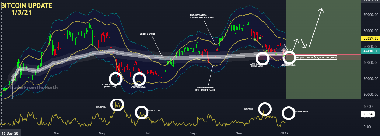 우리는 현재 Bitcoin에서 매우 유사한 모습을 보입니다. 비트코인이 하락한 12월에 VIX 저항선 위로 급증했습니다. 나는 VIX 저항선에 대한 두 번째 급등을 보고 메인 차트에서 또 다른 깊은 저점을 보기를 기다리고 있습니다. 이것은 42,000 - 45,500에서 지원 영역으로 확장될 것입니다. 이 지원 영역은 연간 VWAP를 영역의 상단으로 사용하고 볼린저 밴드의 2차 편차를 영역의 하단으로 사용하여 생성되었습니다.