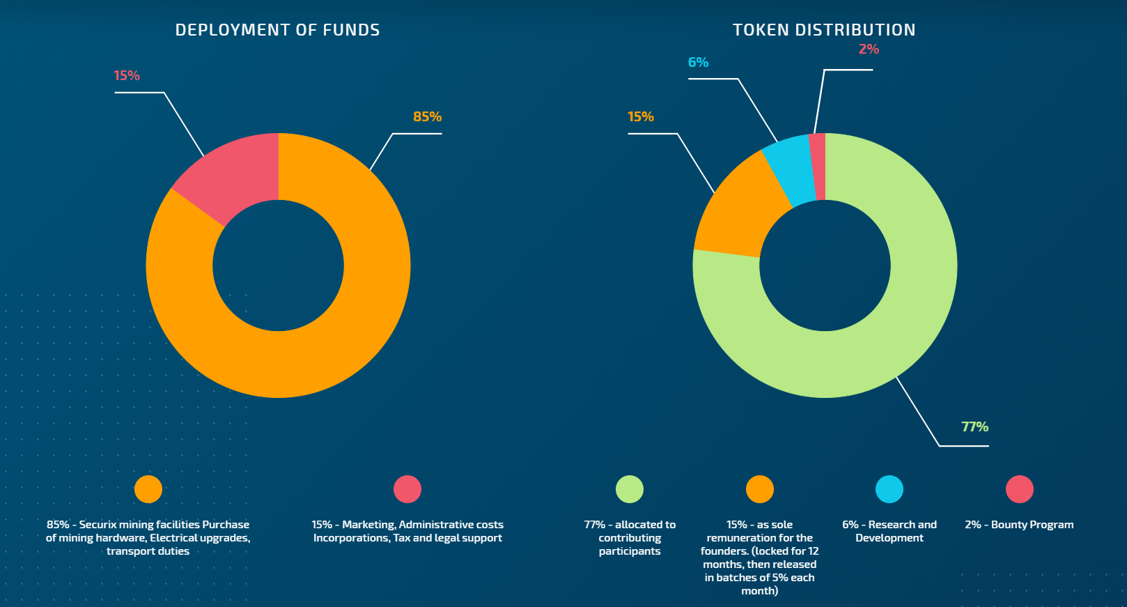 Securix is a Dutch company whose main business is the production of bitcoin. The project is legal and operates under the laws of the Netherlands. The Project team offers its customers a monthly passive income opportunity, for this purpose a service is created and developed that will not have contractual time constraints, like cloud mining, and will provide passive income to holders of SRXIO tokens. In order to start to be engaged in a mining within the framework of the project Securix, it is enough only to get tokens of the company. Has mining ever been so simple? It is planned that 45% of the total produced crypto currency will be distributed among the holders of the tokens. The resources that the company has at its disposal are simply impressive: the area of the company's premises is 10.5 thousand square meters, and the number of mining equipment is 24 thousand! Thanks to such extensive resources, the Company is able to extract 24.5 bitcoins every day.