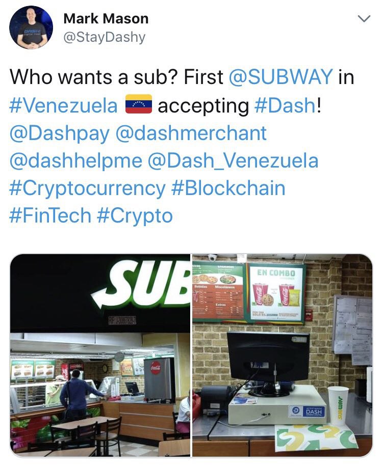 Wer möchte einen Sub? Das erste Subway in Venezuela 🇻🇪 akzeptiert nun Dash als Zahlungsmittel. Bin gespannt wie es in diesem Sektor weiter geht .