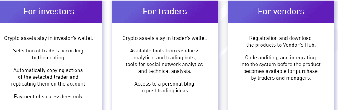 Cindex предлагает систему оценки, использующую историю торговли, которая гарантирует, что вы найдете для вас подходящего менеджера. Здесь все ваши криптоактивные ресурсы для управления постоянно хранятся в вашем кошельке. Децентрализация и интеллектуальные контракты позволяют вам управлять кошельками без перевода средств менеджерам. Инвесторы присоединяются, чтобы синхронизировать свои транзакции с лучшими игроками на рынке.