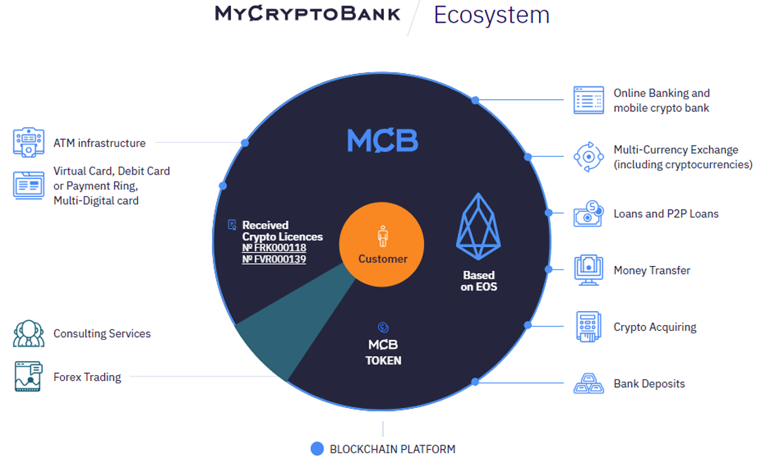 MyCryptoBank — is an online bank allowing any client registered in the electronic bank system to make a full range of bank operations, additional operations with cryptocurrency (payment processing, debit cards, credits and cheap investment products, use of cryptoassets as credit security and many others) based on Blockchain technology without visit of department. So, MyCryptoBank provides services of client’s remote access to accounts, products and bank services in order to make banking operations.