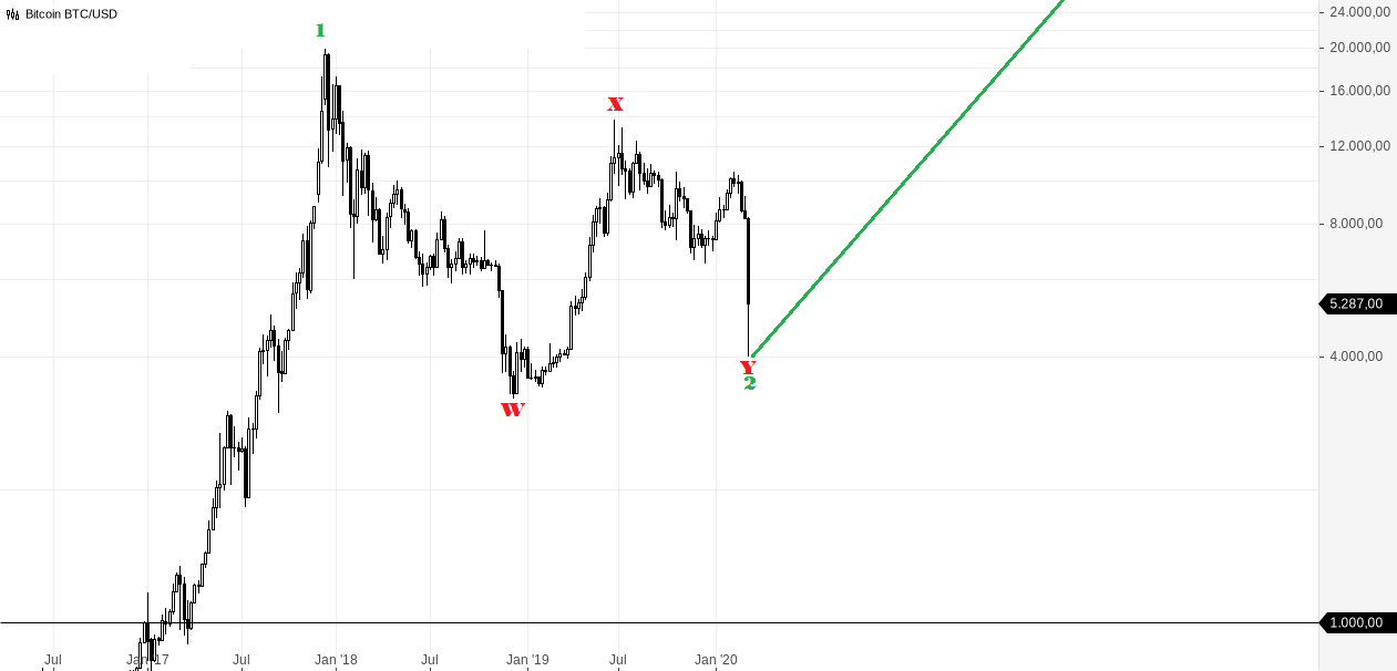 So I have to favor the more bearish count over the two bullish ones. The bearish one expects BTC to drop to 1000$ or close to that.