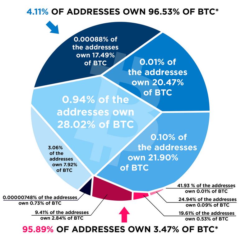 - The first thing is that analyzing the actual Bitcoins wealth distribution can be of a misleading nature because addresses are not people and this is true the other way around as well. Single Bitcoin address can represent multiple individual entities and a single entity can represent multiple addresses. A simple example of this would be a crypto exchange or online wallet, where the asset is being held for millions of different people while in the same time most active Bitcoin users have hundreds of different addresses and these addresses are not looked at as partial wallets.