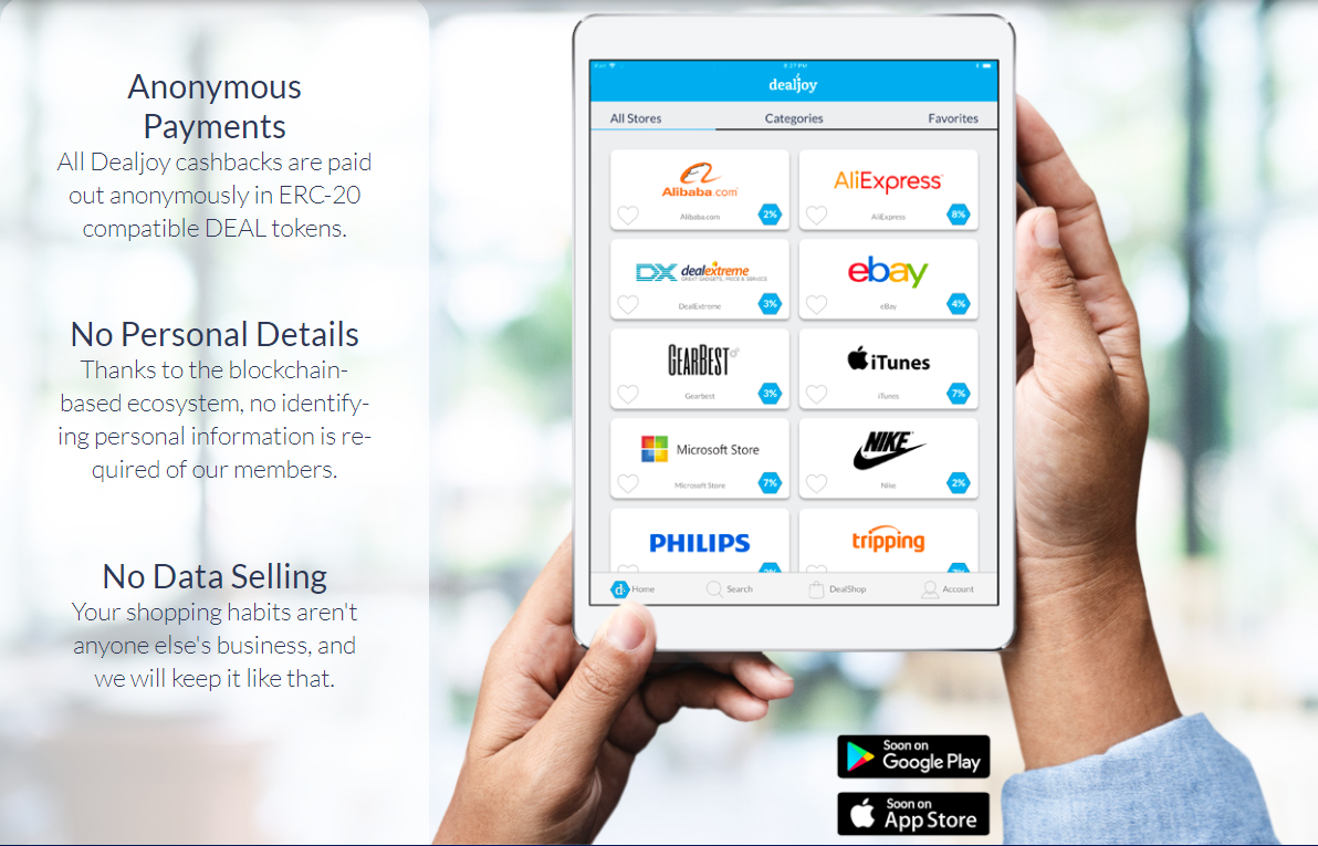 All Dealjoy cashbacks are paid anonymously in the DEAL compatible token ERC-20.
