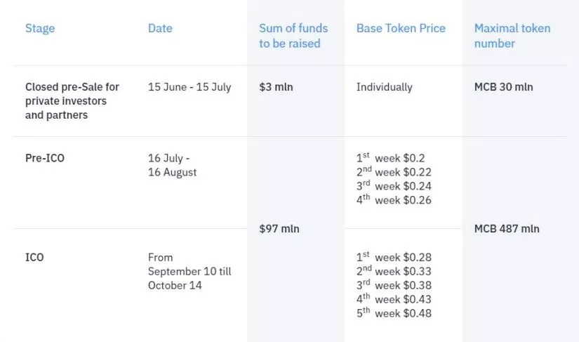 During the ICO MyCryptoBank the MCB tokens will be issued. The basic token price will make 0.2 USD dollars. All the ecosystem tokens will be issued within ICO in maximum quantity of 795.5 million MCB.
